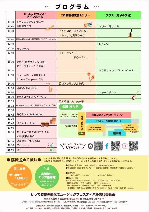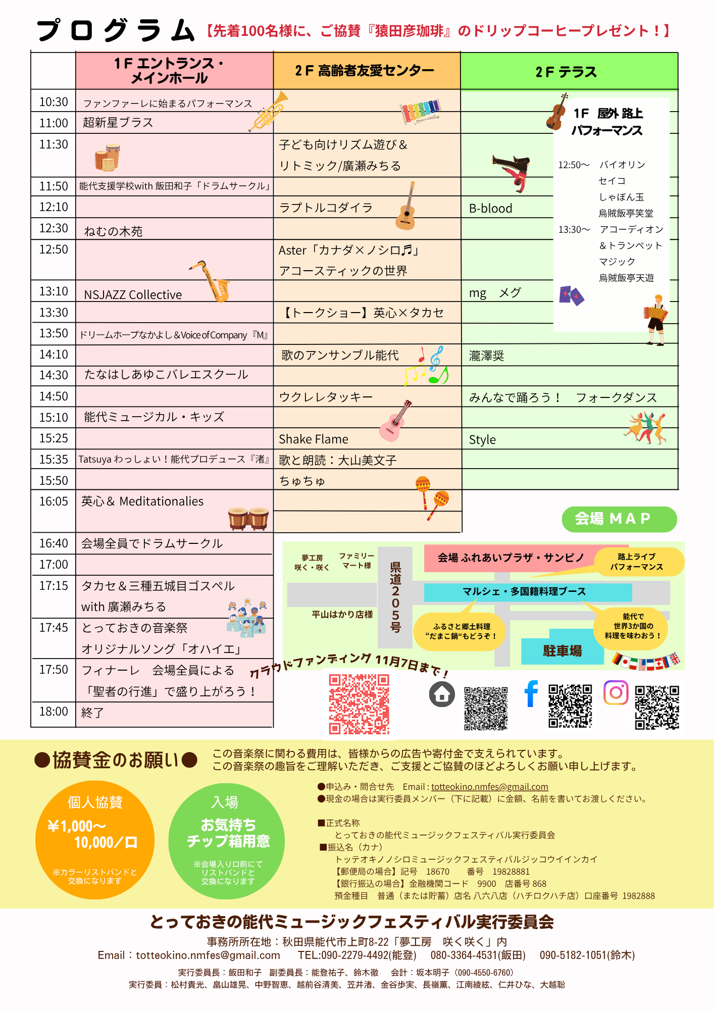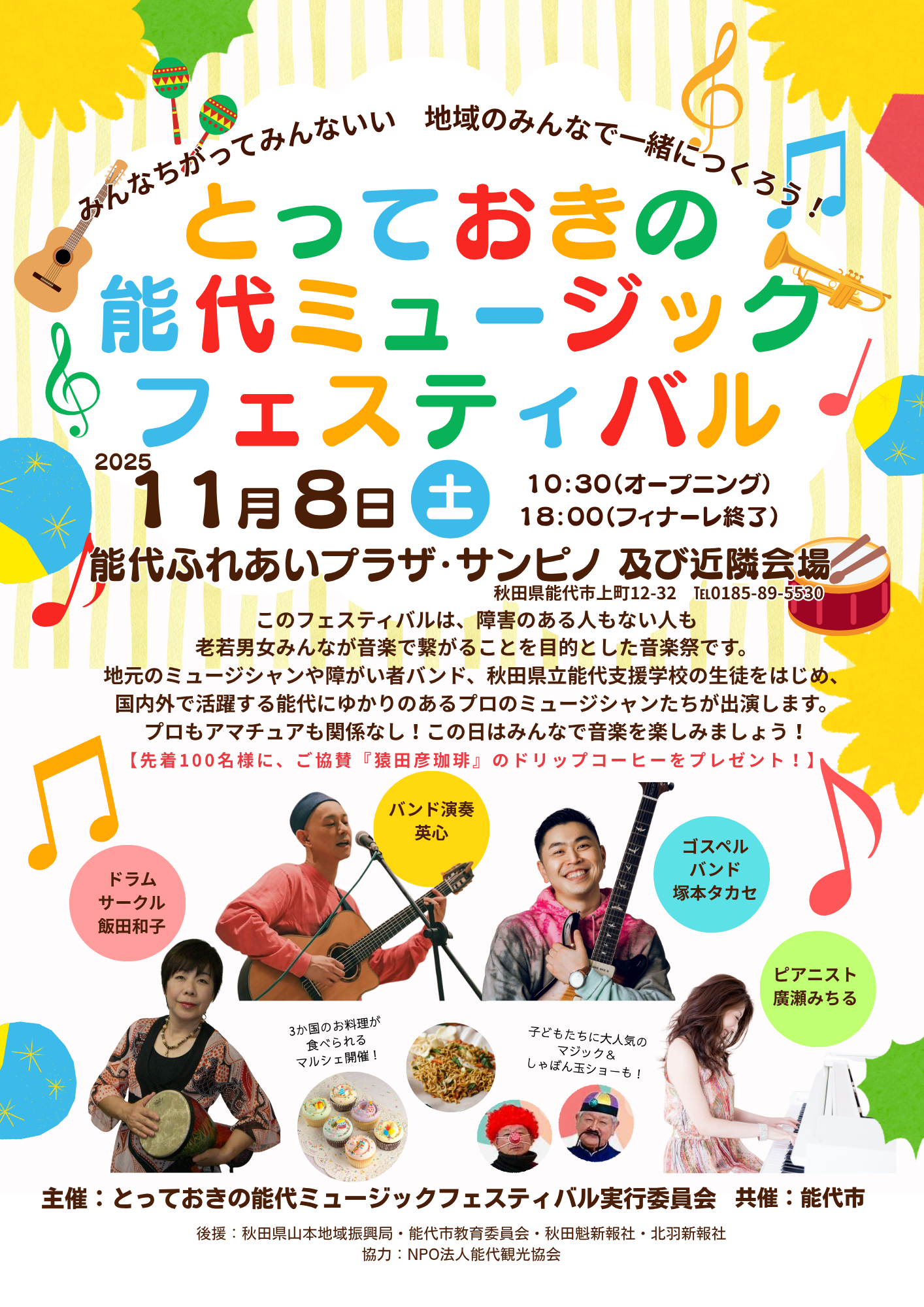 国内外で活躍する能代ゆかりのプロミュージシャンや地元のミュージシャン、そして障がい者のバンド、秋田県立能代支援学校の生徒などが演奏し、客席には障がいの有無を問わず老若男女が集い、音楽で繋がり合う一体感を味わいます。